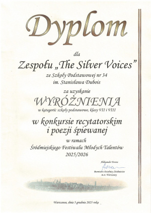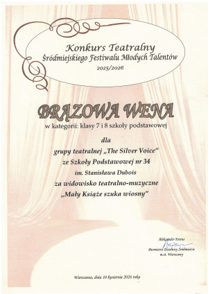 Z radością informujemy, że nasz chór "The Silver Voice" wziął udział w Konkursie Teatralnym 20. Edycji Śródmiejskiego Festiwalu Młodych Talentów 2026 i zdobył Brązową Wenę. Serdecznie gratulujemy młodym i utalentowanym artystom!