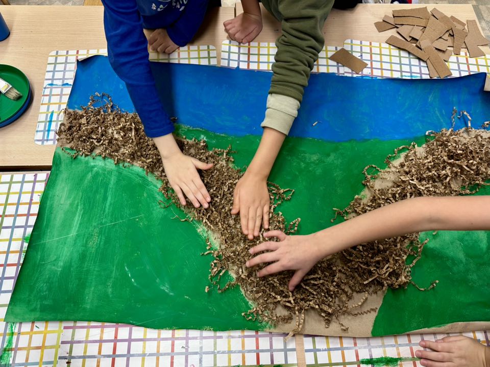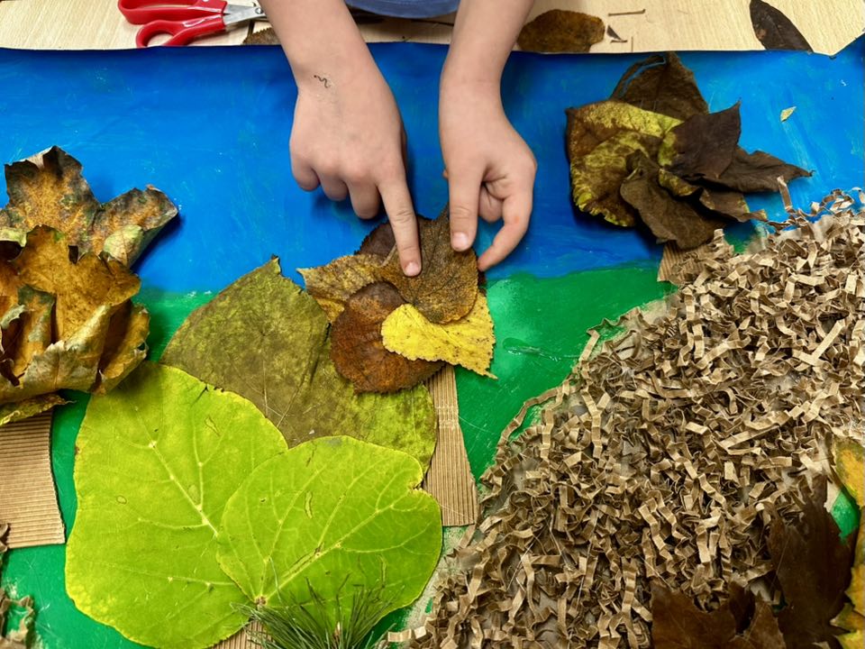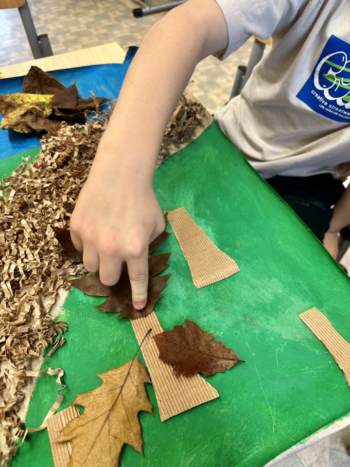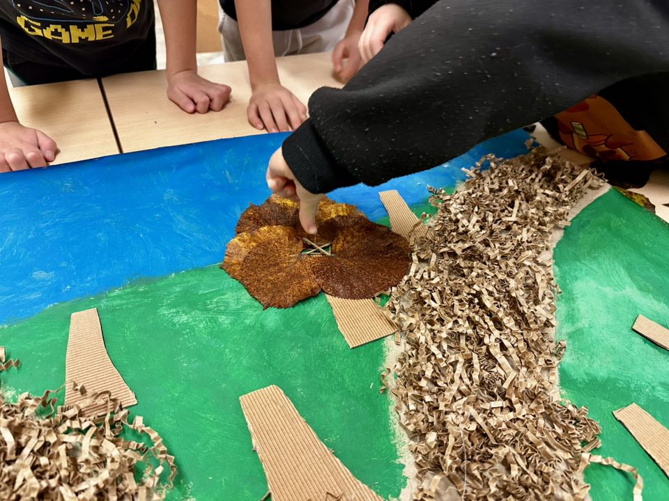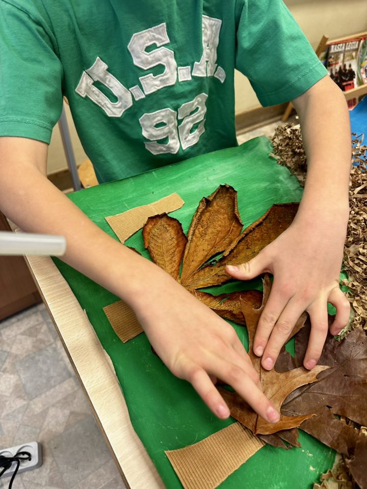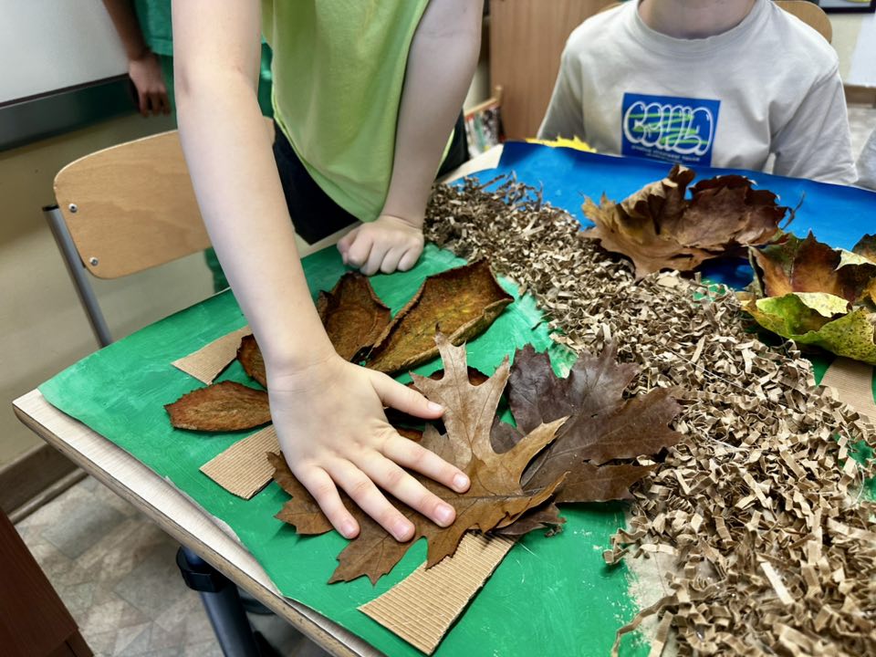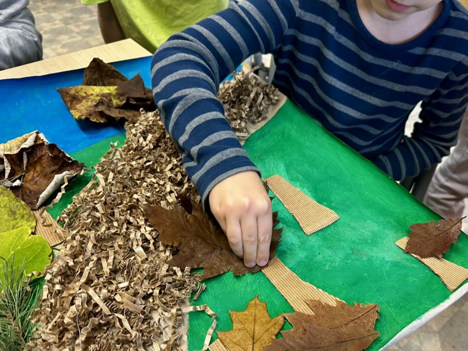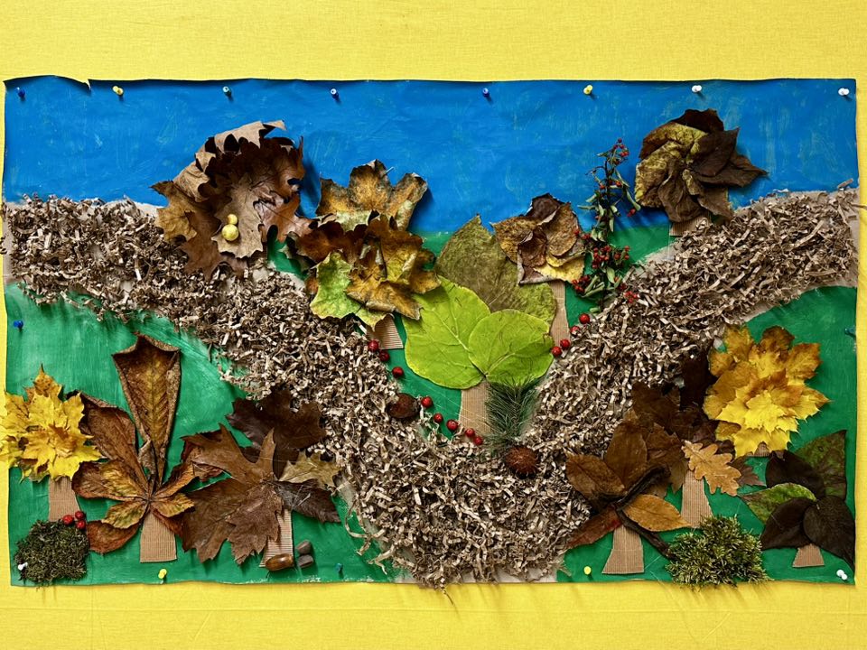 Pierwszoklasiści pieczołowicie zbierali dary jesieni, które wykorzystali przy swojej pracy. Pomysł - park w barwach jesieni. Wykonanie - prawie każde dziecko miało swój wkład w tworzenie pracy. Uczniowie malowali farbami, wycinali z tektury falistej (odzyskanej z opakowania prezentu), a potem przyklejali - pnie drzew, układali i przyklejali liście, jako korony drzew, wykonali z okrywy kasztana i plasteliny - Jeże.