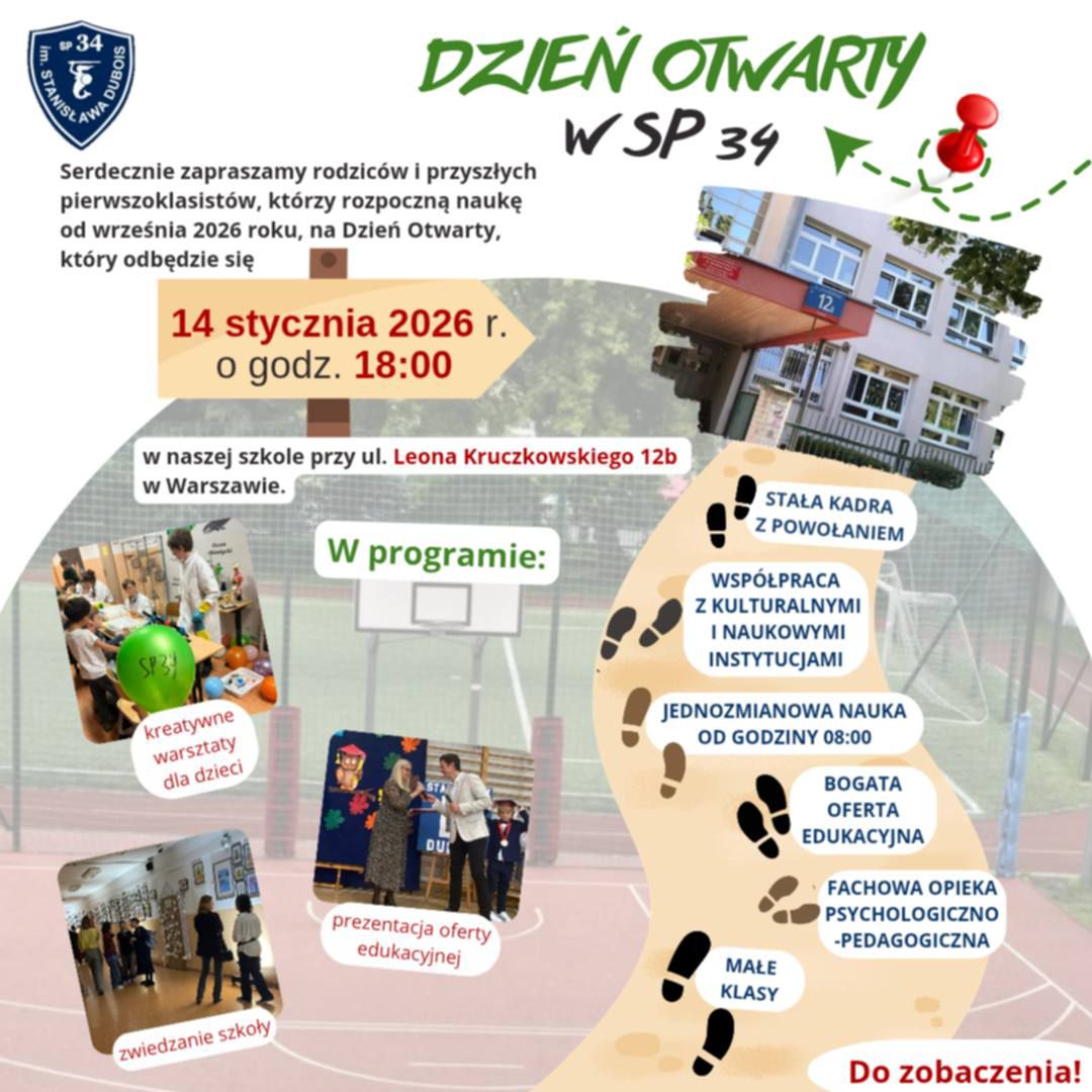 Serdecznie zapraszamy rodziców i przyszłych pierwszoklasistów, którzy rozpoczną naukę od września 2026 roku, na Dzień Otwarty, który odbędzie się 14 stycznia 2026 roku o 18:00 w naszej szkole przy ulicy Kruczkowskiego 12b w Warszawie.