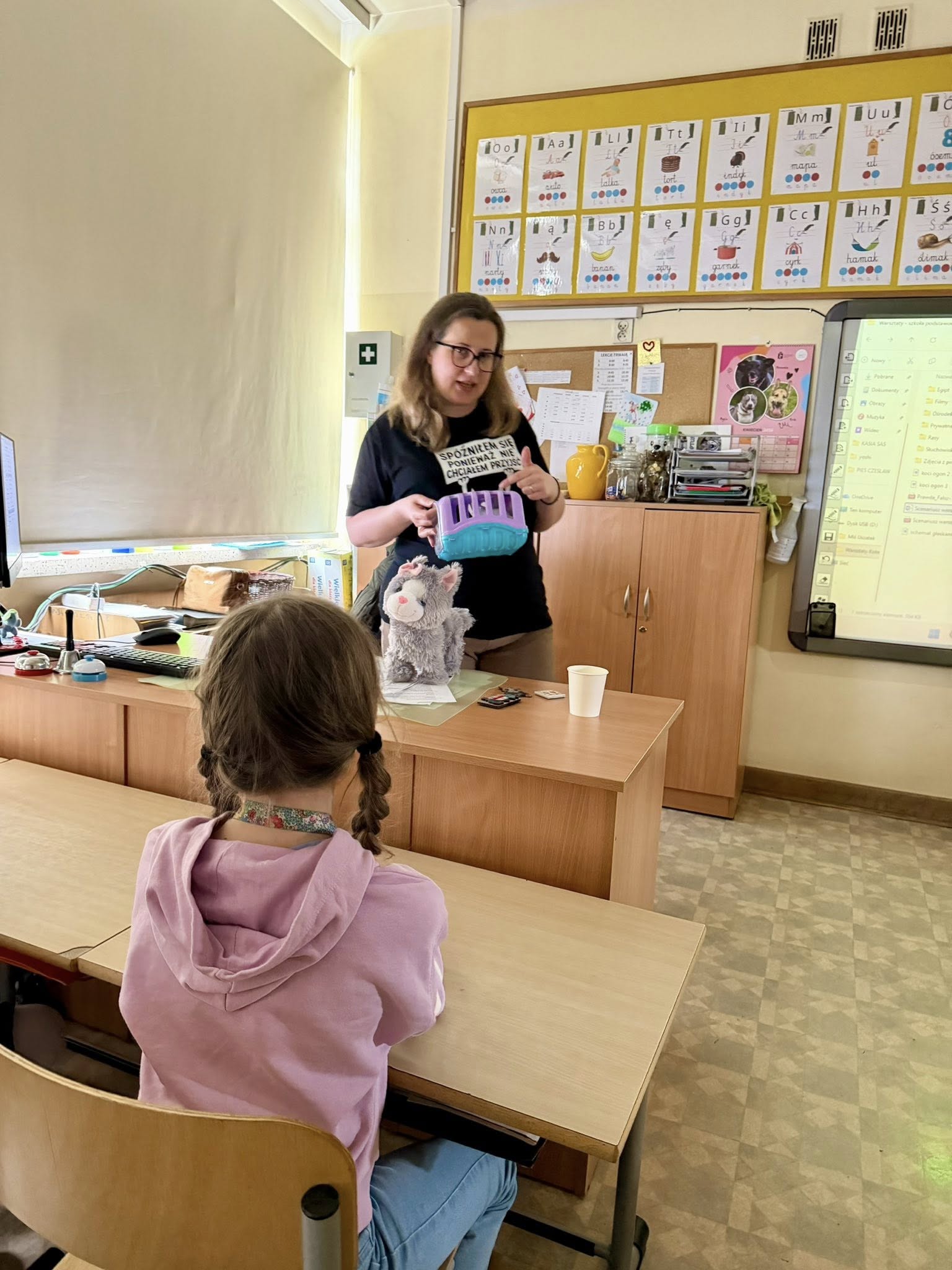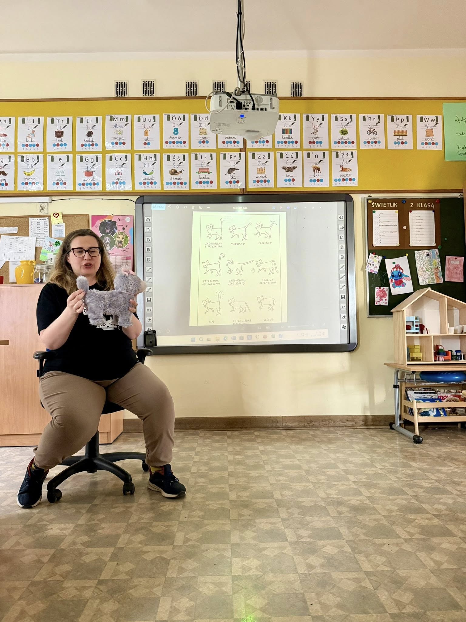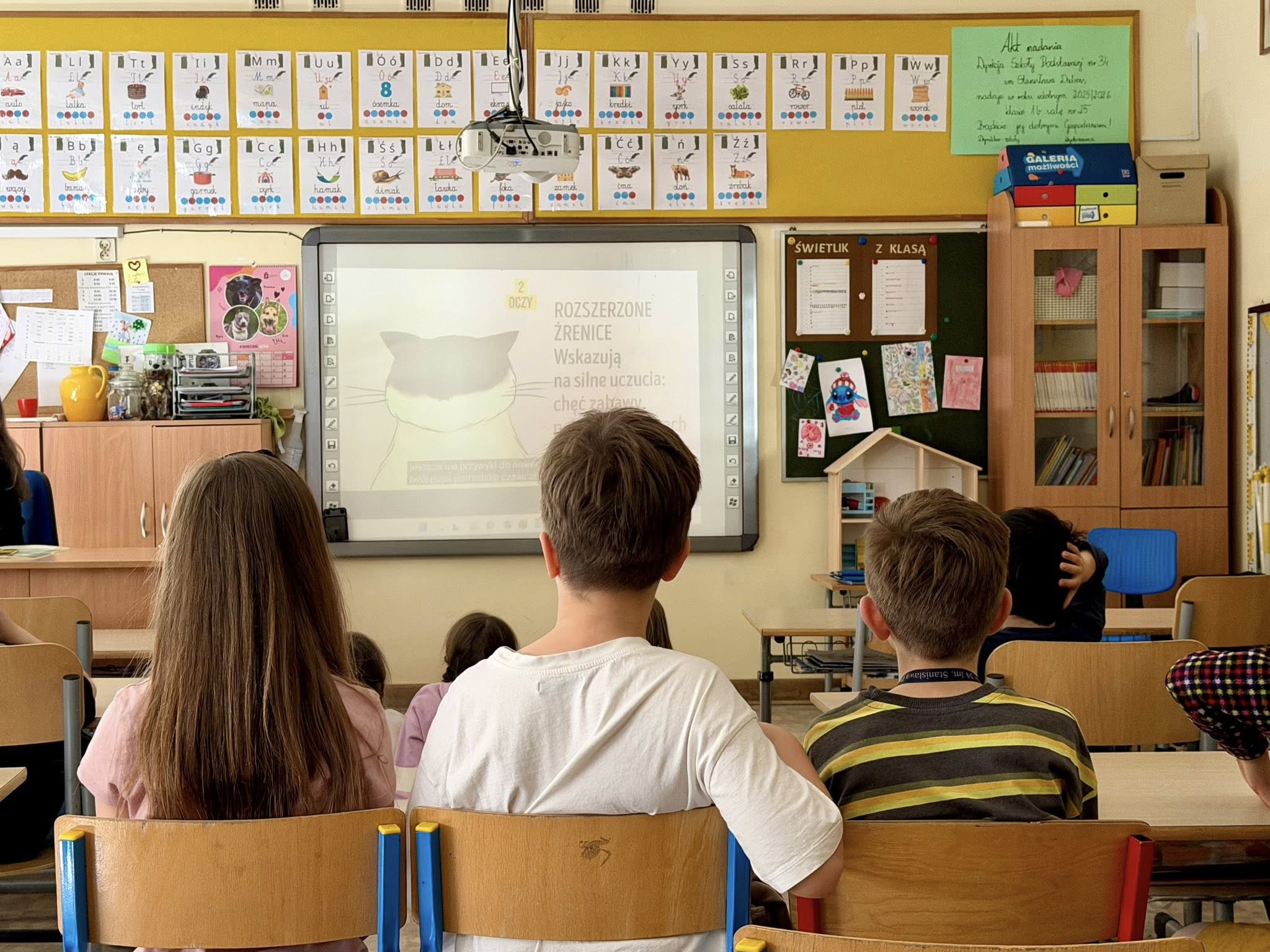 Podczas spotkania dzieci dowiedziały się, jak wygląda opieka nad kotami oraz w jaki sposób można im pomagać. Pani Malwina opowiedziała o swojej pracy i o losach kotów, które trafiają do Koterii. Uczniowie z zainteresowaniem słuchali, zadawali pytania i dzielili się własnymi doświadczeniami. Pod koniec spotkania wolontariuszka pokazała dzieciom zdjęcia podopiecznych fundacji.
