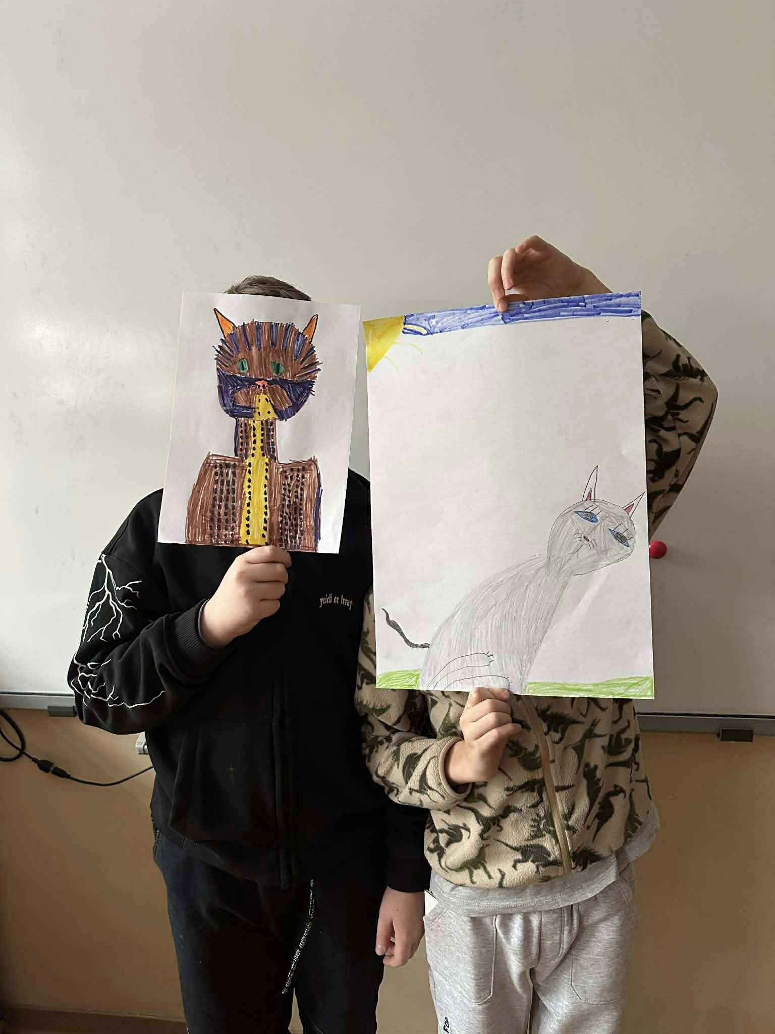 Trzecioklasiści wzięli udział w zajęciach czytelniczych poświęconych tym niezwykłym, mruczącym przyjaciołom. Podczas spotkania dzieci z ogromnym zainteresowaniem wysłuchały opowiadań "Kotka Petriszorka" oraz "Pudełko pełne kotów". Lektura stała się inspiracją do rozmów o kocich zwyczajach, opiece nad zwierzętami oraz o tym, jak ważna jest troska i wrażliwość wobec naszych czworonożnych towarzyszy. Nie zabrakło również części plastycznej - uczniowie z wielkim zaangażowaniem wykonali portrety swoich kotów (a także wymarzonych pupili). Powstały barwne, kreatywne i pełne charakteru prace, które doskonale oddają dziecięcą wyobraźnię i miłość do zwierząt.
